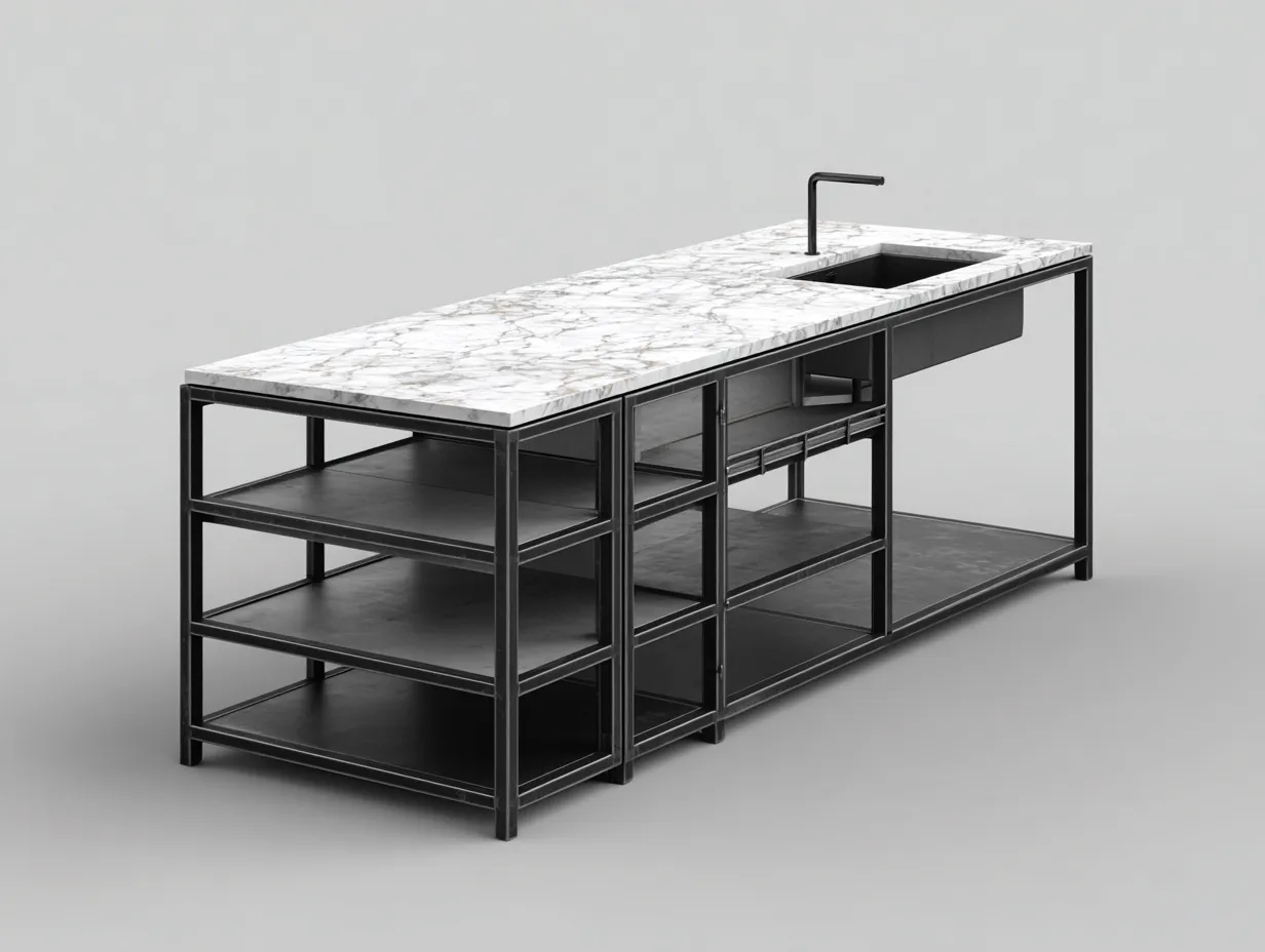 Die Arbeitsplatte ist in Marmoroptik in Weiß ausgeführt, während das Gestell aus Metall in Schwarz gefertigt ist. Die Kombination aus heller Steinoptik und dunklem Rahmen erzeugt einen modernen Kontrast und unterstützt eine stabile Gesamtkonstruktion. Die Oberflächen wirken sachlich, pflegeleicht und passend für funktionale Outdoor-Küchenlösungen.